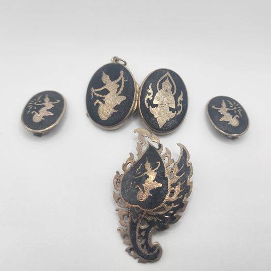 Siam Sterling Silver Brooch, clip on Earrings, Locket Set